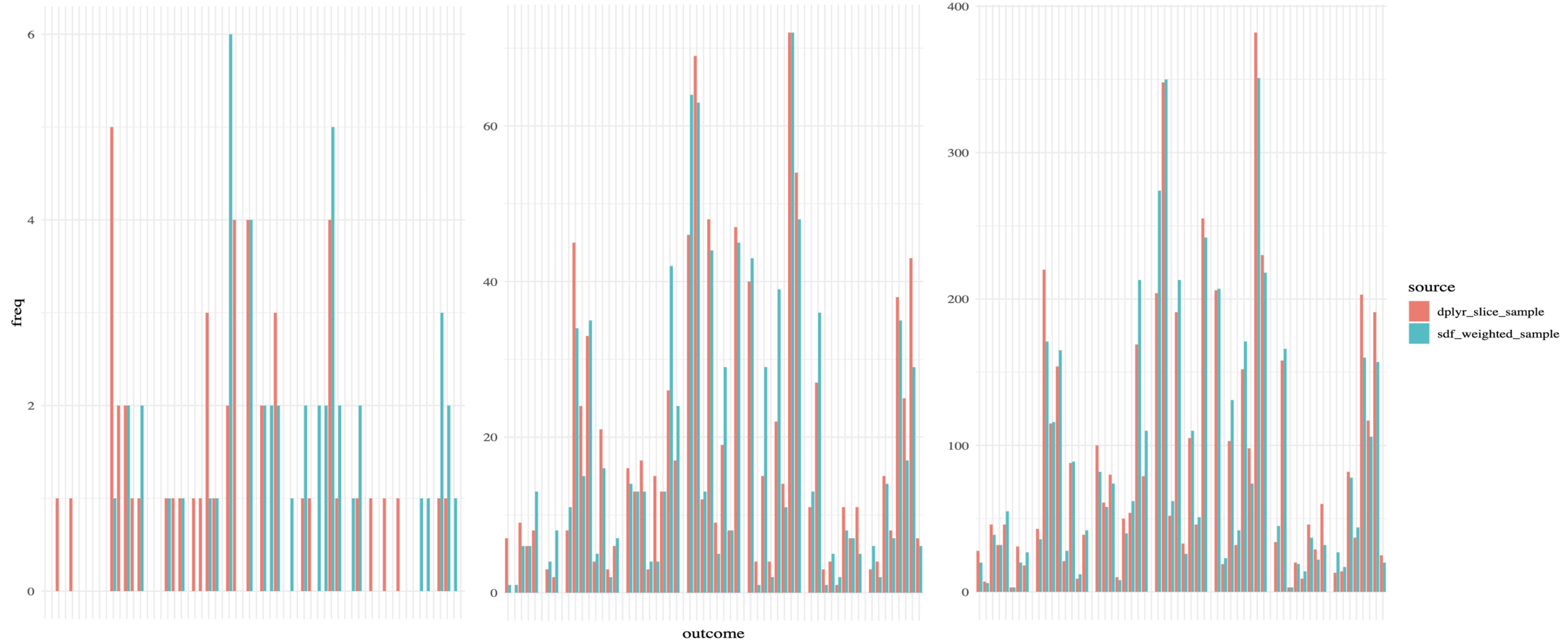 Finally, we can run both dplyr::slice_sample() and sparklyr::sdf_weighted_sample() for arbitrary number of iterations and compare tallied outcomes from both: