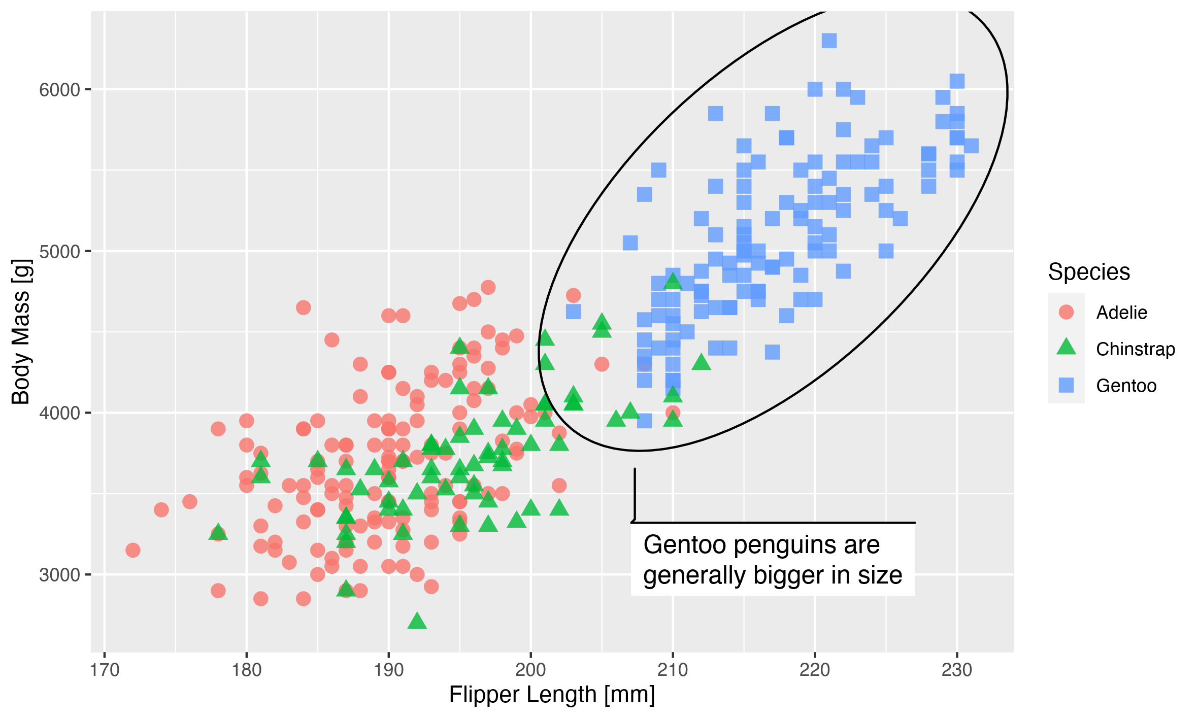 labs(x = "Flipper Length [mm]", y = "Body Mass [g]",  colour = "Species",