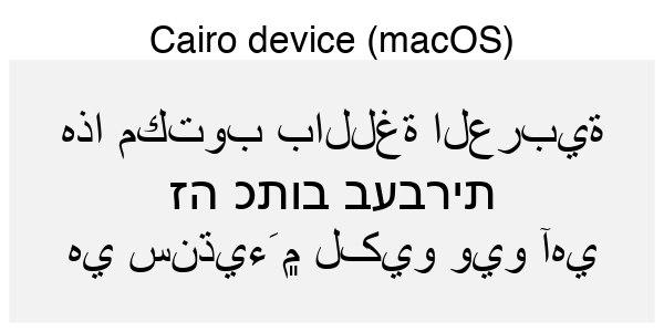 If you’re not familiar with the languages above it can be hard to see what is right and what is wrong. You may, however, look at how the text in the code is rendered in the browser and compare that to the device rendering. If you do that, you can see that the Hebrew script is rendered in the wrong direction for all the non-ragg devices (except Cairo on Linux). For the Arabic and Sindhi it’s even harder to see what’s wrong because the text looks fundamentally different. That’s because both Arabic and Sindhi rely extensively on text substitution rules and ligatures; the way a letter is written depends critically on what letters it is next to. Still, by comparing to the browser rendering you can see that the same devices failing on the Hebrew script fail here as well.