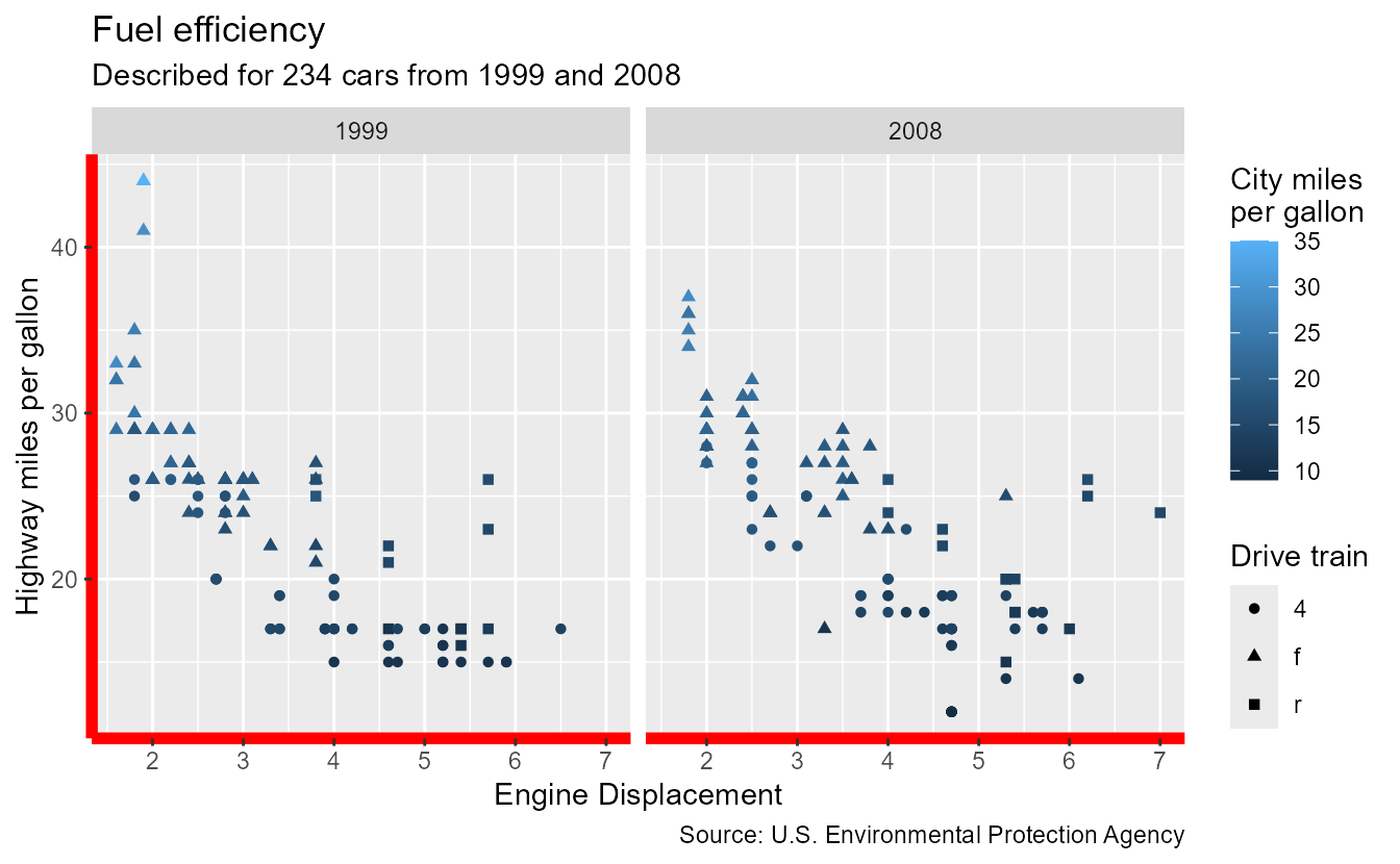 p <- ggplot(mpg, aes(displ, hwy, colour = cty, shape = drv)) +
