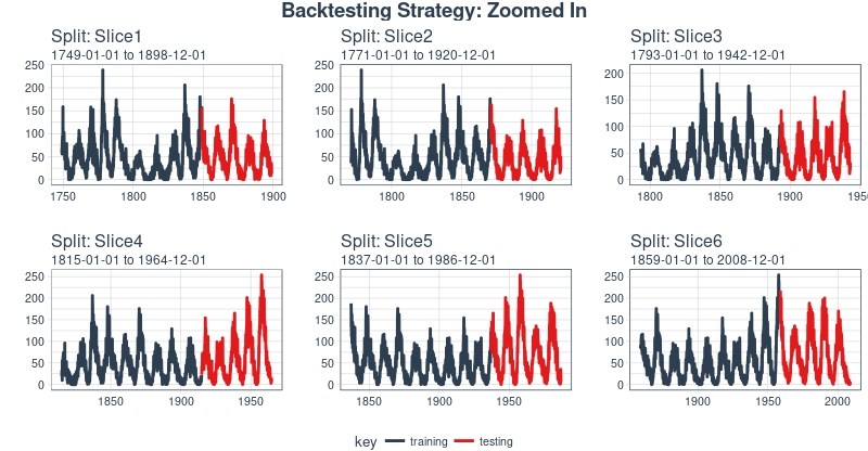 # Plotting function for a single splitplot_split<-function(split,expand_y_axis=TRUE,alpha=1,size=1,base_size=14){# Manipulate datatrain_tbl<-training(split)%>%add_column(key="training")test_tbl<-testing(split)%>%add_column(key="testing")data_manipulated<-bind_rows(train_tbl,test_tbl)%>%as_tbl_time(index=index)%>%mutate(key=fct_relevel(key,"training","testing"))# Collect attributestrain_time_summary<-train_tbl%>%tk_index()%>%tk_get_timeseries_summary()test_time_summary<-test_tbl%>%tk_index()%>%tk_get_timeseries_summary()# Visualizeg<-data_manipulated%>%ggplot(aes(x=index,y=value,color=key))+geom_line(size=size,alpha=alpha)+theme_tq(base_size=base_size)+scale_color_tq()+labs(title=glue("Split: {split$id}"),subtitle=glue("{train_time_summary$start} to ","{test_time_summary$end}"),y="",x="")+theme(legend.position="none")if(expand_y_axis){sun_spots_time_summary<-sun_spots%>%tk_index()%>%tk_get_timeseries_summary()g<-g+scale_x_date(limits=c(sun_spots_time_summary$start,sun_spots_time_summary$end))}g}