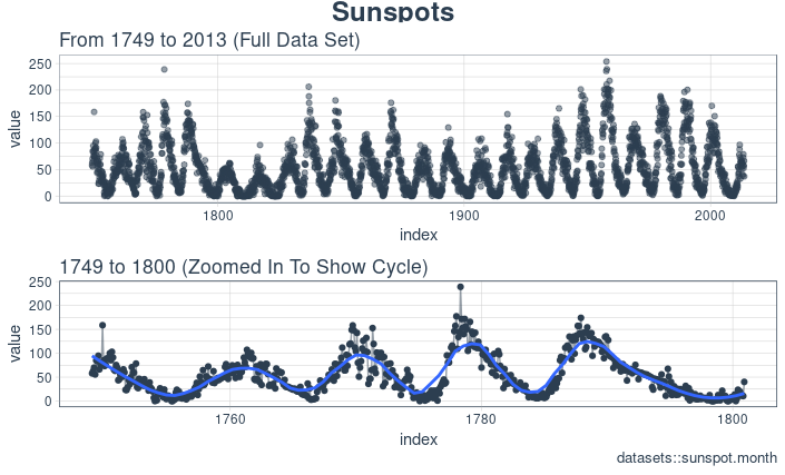 p1<-sun_spots%>%ggplot(aes(index,value))+geom_point(color=palette_light()[[1]],alpha=0.5)+theme_tq()+labs(title="From 1749 to 2013 (Full Data Set)")p2<-sun_spots%>%filter_time("start"~"1800")%>%ggplot(aes(index,value))+geom_line(color=palette_light()[[1]],alpha=0.5)+geom_point(color=palette_light()[[1]])+geom_smooth(method="loess",span=0.2,se=FALSE)+theme_tq()+labs(title="1749 to 1759 (Zoomed In To Show Changes over the Year)",caption="datasets::sunspot.month")p_title<-ggdraw()+draw_label("Sunspots",size=18,fontface="bold",colour=palette_light()[[1]])plot_grid(p_title,p1,p2,ncol=1,rel_heights=c(0.1,1,1))