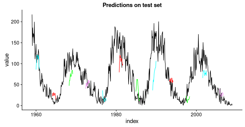 plot_test<-function(slice,name){ggplot(slice,aes(x=index,y=value))+geom_line()+geom_line(aes(y=pred_test1),color="cyan")+geom_line(aes(y=pred_test50),color="red")+geom_line(aes(y=pred_test100),color="green")+geom_line(aes(y=pred_test150),color="violet")+geom_line(aes(y=pred_test200),color="cyan")+geom_line(aes(y=pred_test250),color="red")+geom_line(aes(y=pred_test300),color="green")+geom_line(aes(y=pred_test350),color="cyan")+geom_line(aes(y=pred_test400),color="red")+geom_line(aes(y=pred_test450),color="green")+geom_line(aes(y=pred_test500),color="cyan")+geom_line(aes(y=pred_test550),color="violet")+ggtitle(name)}test_plots<-map2(all_split_preds_test$predict,all_split_preds_test$id,plot_test)p_body_test<-plot_grid(plotlist=test_plots,ncol=3)p_title_test<-ggdraw()+draw_label("Backtested Predictions: Test Sets",size=18,fontface="bold")plot_grid(p_title_test,p_body_test,ncol=1,rel_heights=c(0.05,1,0.05))