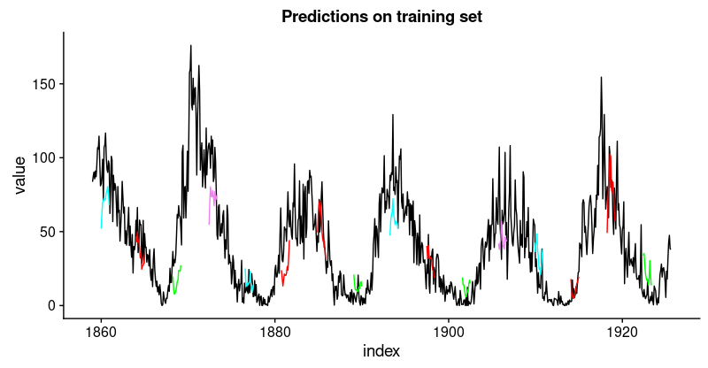 pred_train<-model%>%predict(X_train,batch_size=FLAGS$batch_size)%>%.[,,1]# Retransform values to original scalepred_train<-(pred_train*scale_history+center_history)^2compare_train<-df%>%filter(key=="training")# build a dataframe that has both actual and predicted valuesfor(iin1:nrow(pred_train)){varname<-paste0("pred_train",i)compare_train<-mutate(compare_train,!!varname:=c(rep(NA,FLAGS$n_timesteps+i-1),pred_train[i,],rep(NA,nrow(compare_train)-FLAGS$n_timesteps*2-i+1)))}