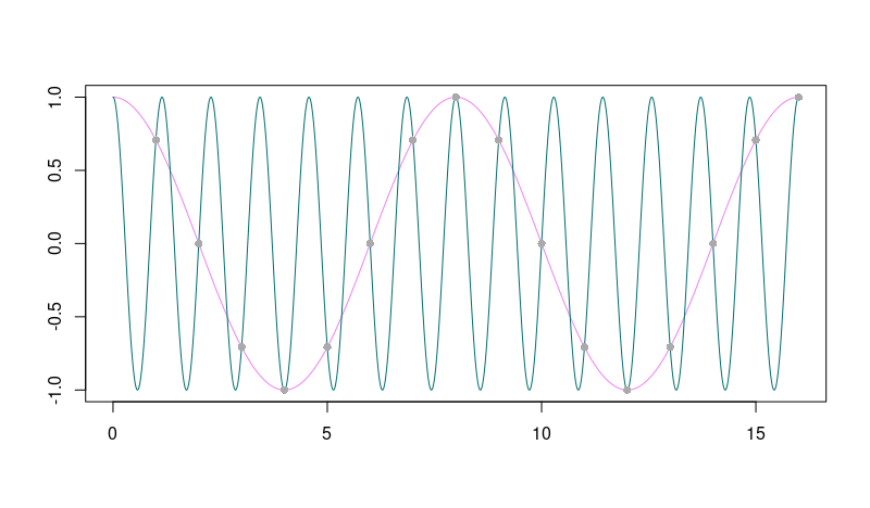 If the sampling rate is too low, aliasing takes place: Higher frequencies alias themselves as lower frequencies. This means that not only can’t we get them, they also corrupt the magnitudes of corresponding lower frequencies they are being added to. Here’s a schematic example of how a high-frequency signal could alias itself as being lower-frequency. Imagine the high-frequency wave being sampled at integer points (grey circles) only: