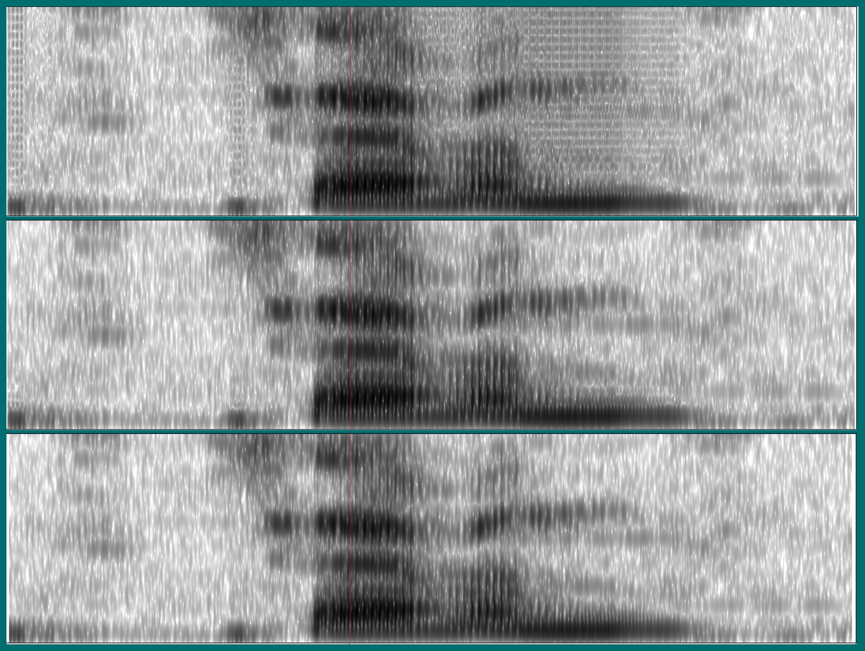 Another input to the STFT to play with is the type of window used to weight the samples in a time slice. Here again are three spectrograms of the above recording of seven, using, respectively, a Hamming, a Hann, and a Gaussian window: