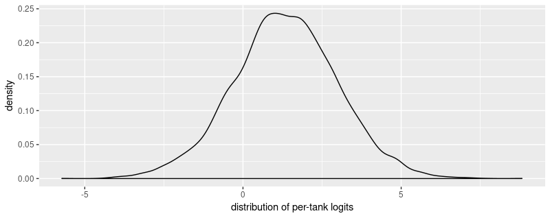 The multi-level model – or varying intercepts model, in this case: we’ll get to varying slopes in a later post – adds a hyperprior to the model. Instead of deciding on a mean and variance of the normal prior the logits are drawn from, we let the model learn means and variances for individual tanks. These per-tank means, while being priors for the binomial logits, are assumed to be normally distributed, and are themselves regularized by a normal prior for the mean and an exponential prior for the variance.