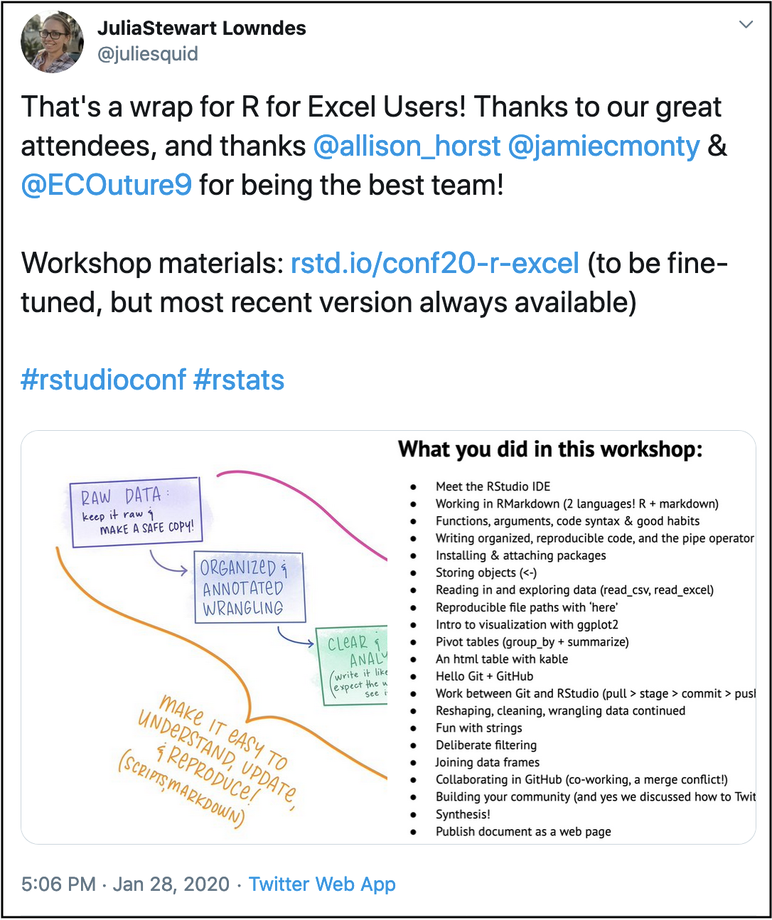 Focusing on #rstats communities at our workshop was especially important to us because of our audience. These folks were coming to a 2400-person conference all about R – and they did not yet know R! That seems scary! Anything we could do to not only teach them about reproducible workflows but also make the conference easier to navigate for a newcomer we felt was time well spent. Thus, we deliberately focused time on R learning communities that they would see and can get involved in at the conference and afterwards. And, we included a discussion about how Twitter is a legit tool for R, and how to get started.