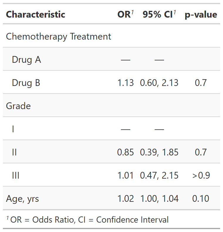 The gtsummary package provides an elegant and flexible way to create publication-ready analytical and summary tables in R.