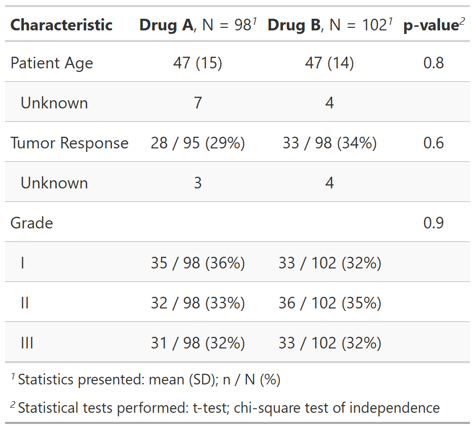 Throughout the post we will use an example dataset of 200 subjects treated with either Drug A or Drug B, with a mix of categorical, dichotomous, and continuous demographic and response data. The dataset has label attributes (using the labelled package) for column names.