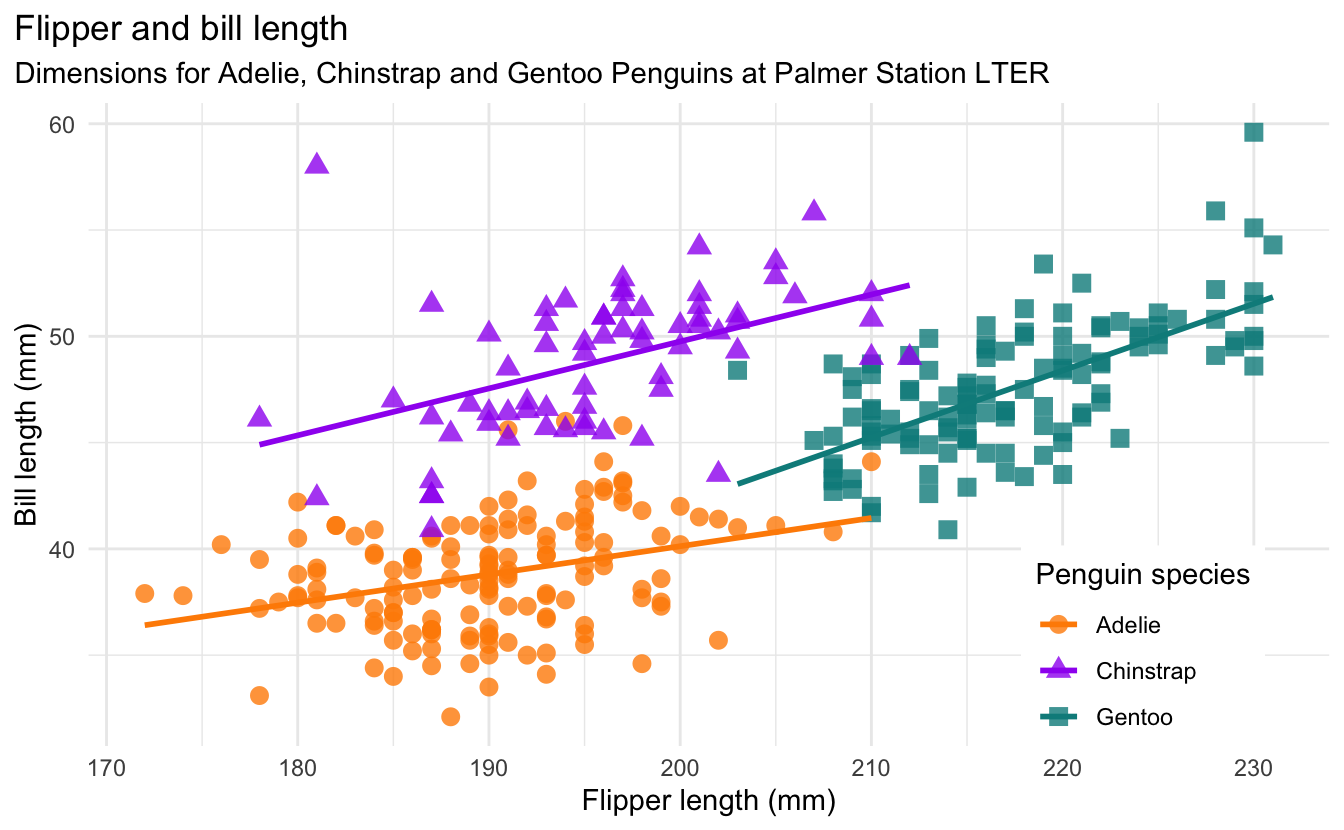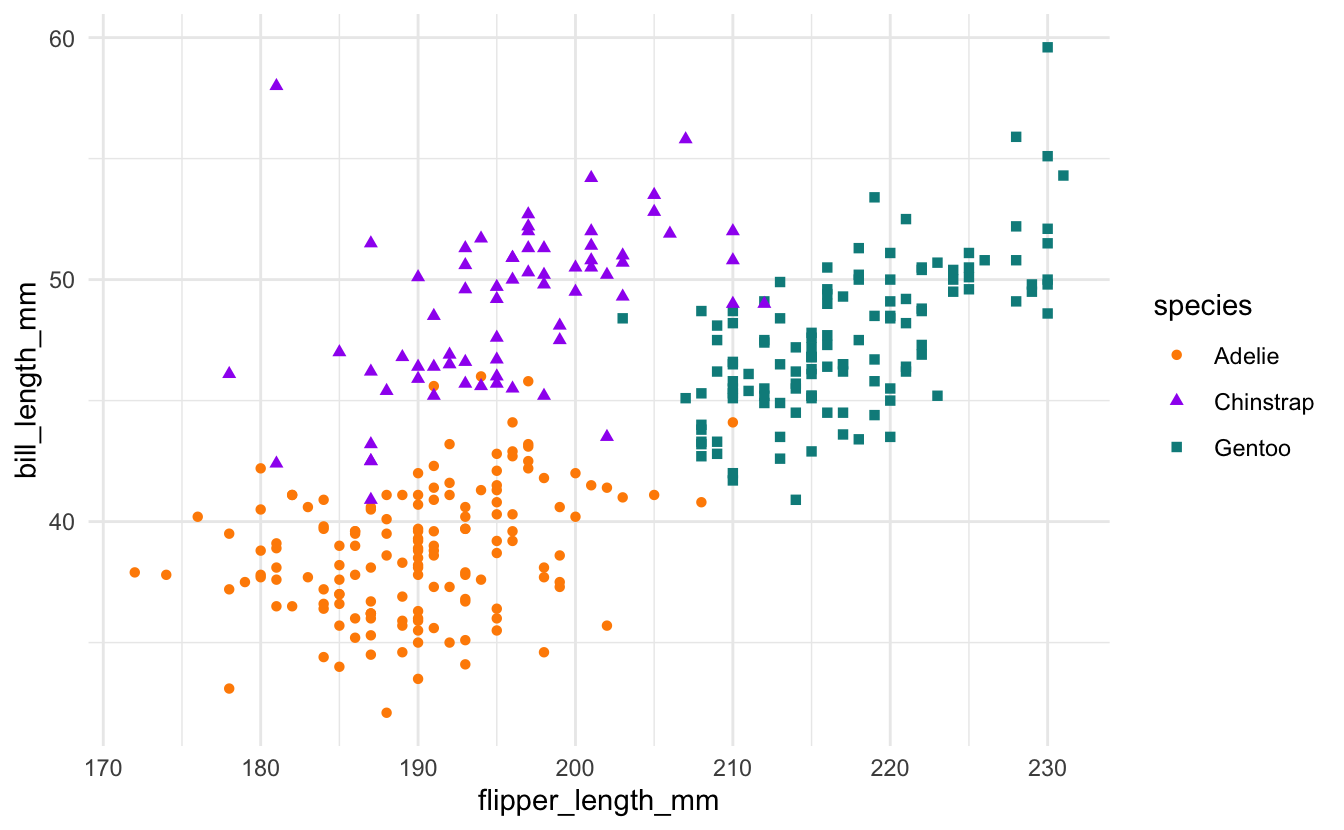 . Here is just one example, plotting the lengths of penguin flippers versus their bills: