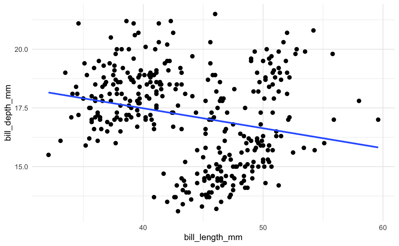 Penguin bill length and depth also show some interesting patterns. If you ignore species, you might think there is a negative correlation: