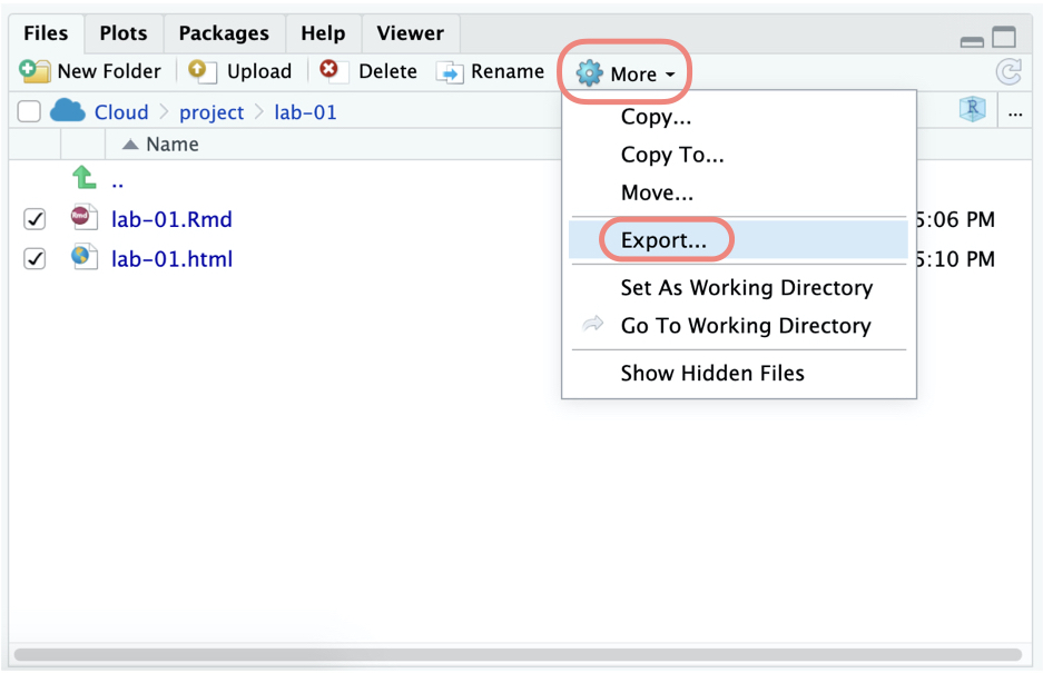 - Upload to learning management system (LMS): If students are working locally, students will have local copies of their files that they can upload to your LMS. If they’re using RStudio Cloud or other server access, they can select the files they need to submit from the Files pane in RStudio, then go to More -> Export, which will download all selected files as a zipped folder. They can either unzip and upload, or upload as is (especially since some LMSs have restrictions on file types they allow, but usually most zip files).