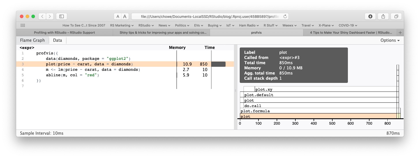 With R, we can find some very useful solutions for verifying which parts of our code are less effective. One of my favorite tools is the profvis package, whose output is shown below: