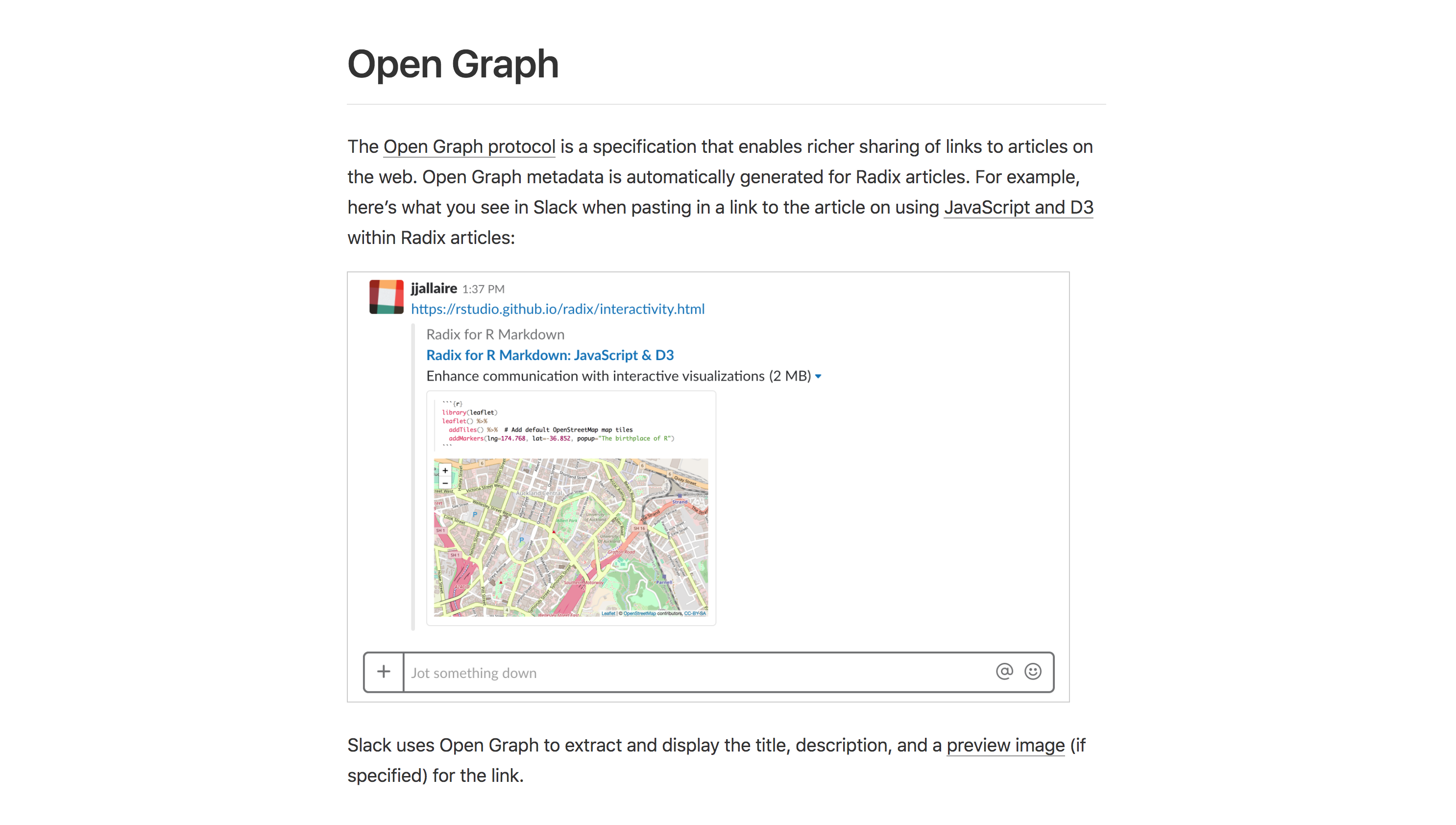 Radix also automatically includes standard Open Graph and Twitter Card metadata. This makes links to your article display rich metadata when shared in various places: