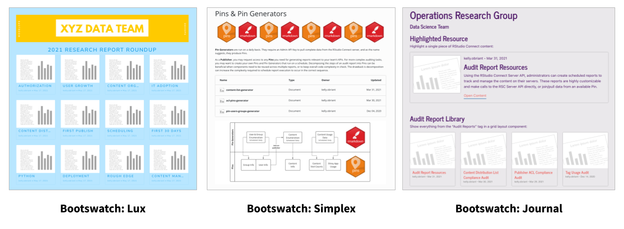 Card and grid components display metadata about each piece of content. Each card or grid item links to the “open solo” version of the associated content item on RStudio Connect.
