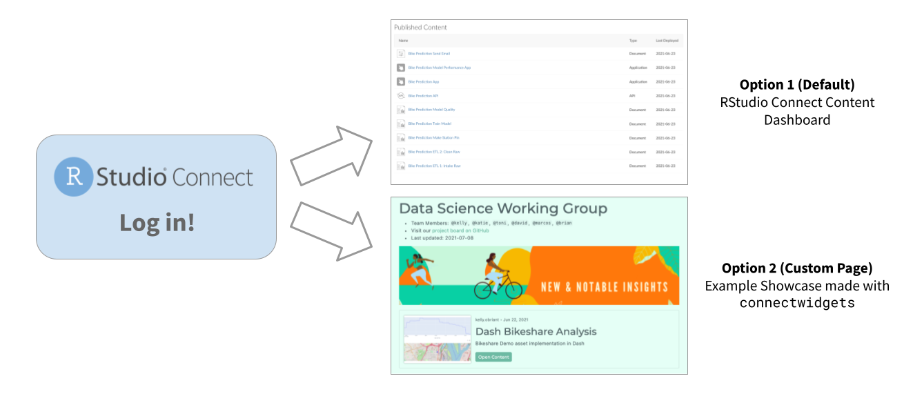 If you’ve created a showcase page that you’d like to route all RStudio Connect visitors to see upon logging in, work with your server administrator to configure Server.RootRedirect