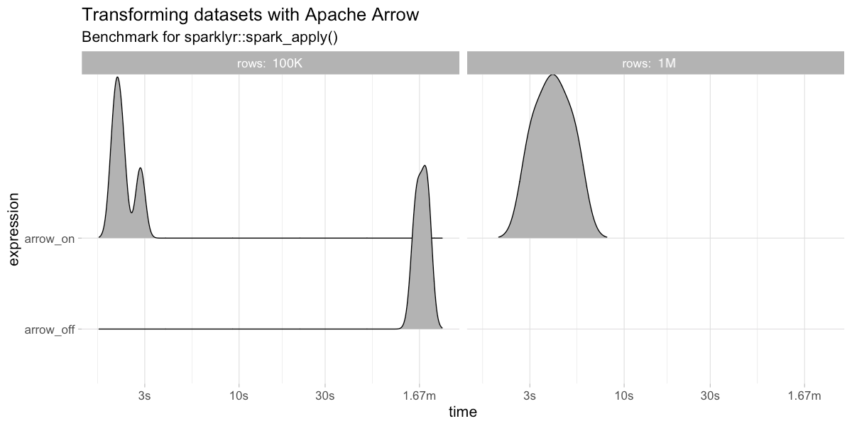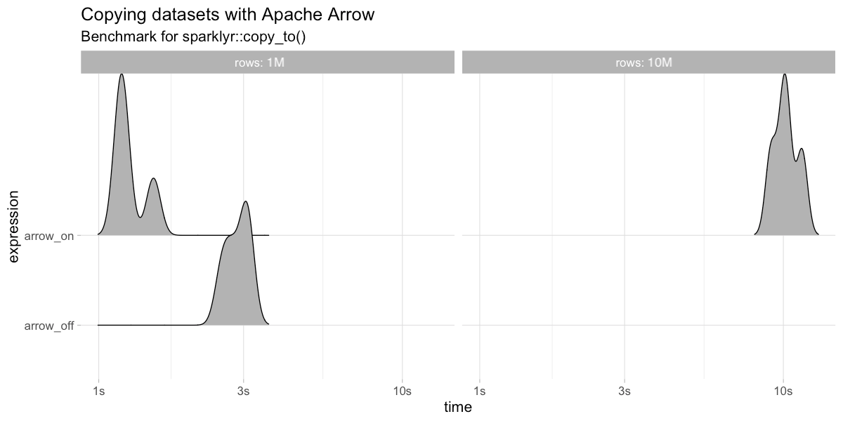 In practice, this means faster data transfers and support for larger datasets; specifically, this improves collect(), copy_to() and spark_apply(). The following benchmarks make use of the bench
