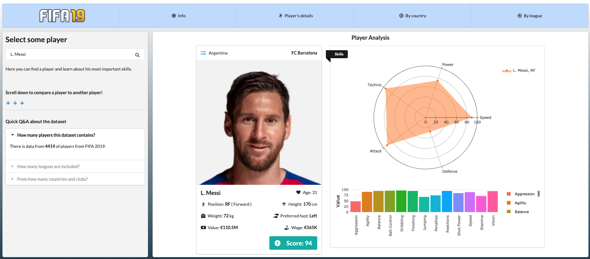 Inspired by Ekrem Bayar’s FIFA ‘19 Shiny dashboard and using data from the SoFIFA dataset, this application by Dominik Krzemiński lets users explore FIFA ‘19 data by comparing teams, players, and leagues. This app is a great example of all the different visualizations available in Shiny, and for being developed in under 10 hours, we are quite impressed! Dominik leads the development of open source packages at Appsilon, so it’s no surprise that he has such a great handle on shiny.semantic’s capabilities.